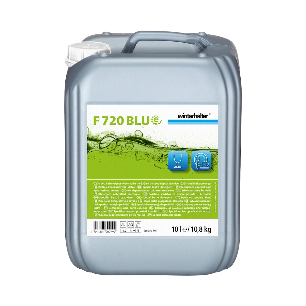 F 720 BLUe ist ein flüssiger, abwasserneutraler, materialschonender Reiniger für gewerbliche Geschirrspülmaschinen. Dieser entfernt wirkunsvoll angetrocknete Speisereste. F 720 BLUe kann zum Spülen von Geschirr, Gläsern, Besteck sowie Gegenständen aus Kunststoff, Edelstahl, Aluminium und Silber eingesetzt werden. Aufgrund seiner speziellen Rezeptur ist er weder ätzend noch reizend, in der Anwendungslösung pH-neutral und besonders umweltfreundlich.