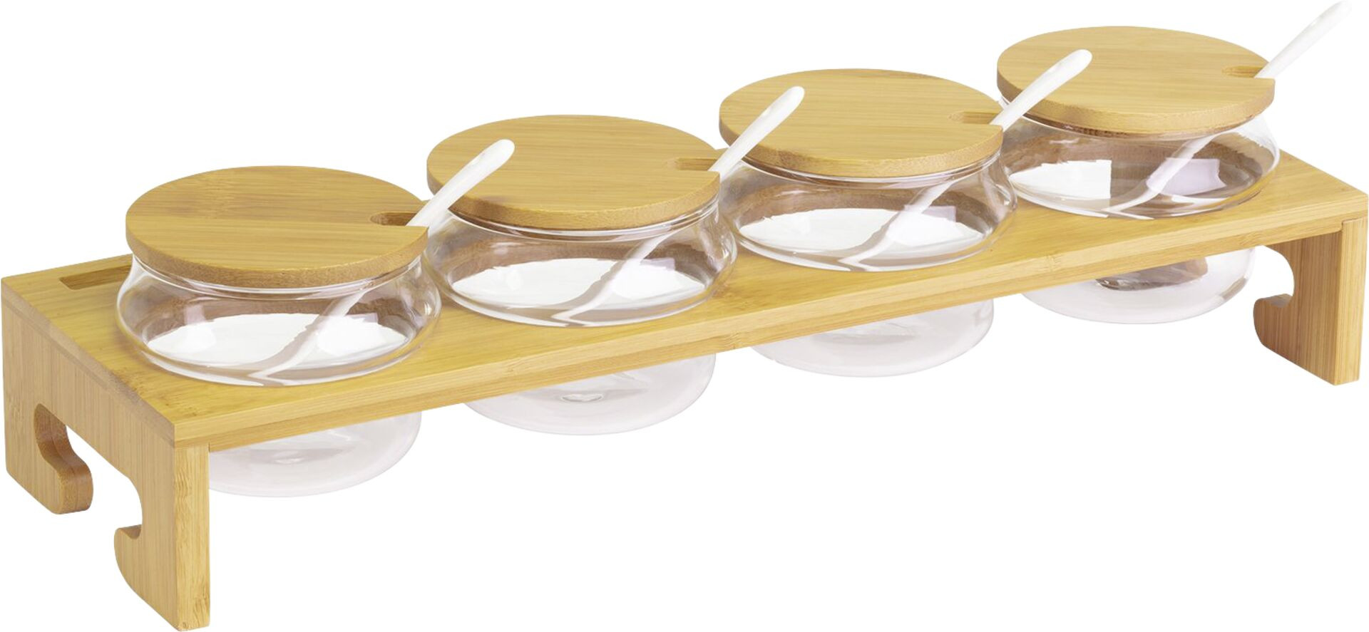 Set bestehend aus 4 Gläsern à 200ml (spülmaschinengeeignet), 4 Deckeln mit Löffelausschnitt (Bambus, Handwäsche empfohlen ), 4 Keramiklöffeln (spülmaschinengeeignet), 1 Gestell (Bambus) mit eingearbeiteter Ablage für die Deckel. Bambus mit lebensmittelechter Beschichtung. Handwäsche empfohlen.